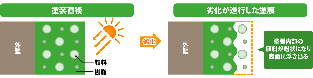 その結果、塗膜の内部にあった顔料が粉状になって表面に浮き出しチョーキングとして現れます。