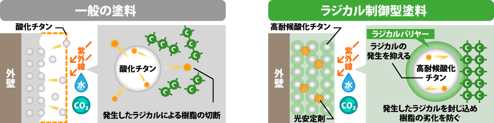ラジカル制御型塗料は、塗膜の劣化を進める原因となる「ラジカル」の発生を抑える成分を配合しているため、チョーキングが起こりにくいという特長があります。